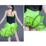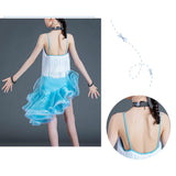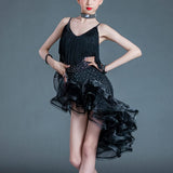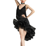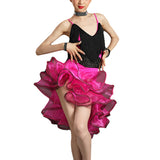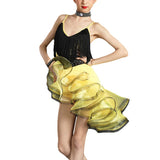 Features: multicolor fringed ruffled dance skirt, sleeveless suspender design, with shiny rhinestones, irregular skirt, fluffy skirt, more flexible when dancing