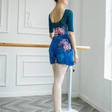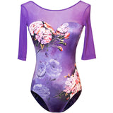We are huge fans of this modern ballet leotard. This floral print leotard features a crew neck, half sleeve. Made from milk silk.