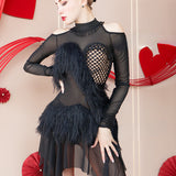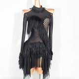 Bring about a memorable performance look with this modern latin dress. This knee-length dress features a high neck, long sleeve. Made from polyester.