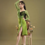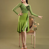 Bring about a memorable performance look with this modern latin dress. This knee-length dress features a v neck, long sleeve. Made from cotton.
