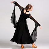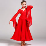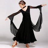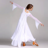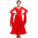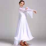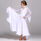 Shine with the glitz and glamour of Broadway in this classic ballroom dress. This long dress features a v neck, long sleeve. Made from milk silk.