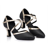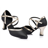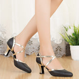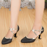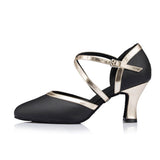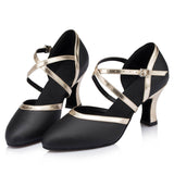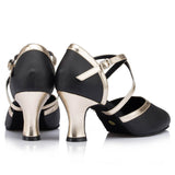 Spark the stage like a streak of lightning in these stylish ballroom shoes. These 2.7" flared shoes feature a closed toe cross straps, solid color pattern. Made from leather/PU.