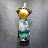 Sparkle and glow in this stylish Latin dress. This short dress features a mandarin collar, cap sleeve. Made from milk silk.