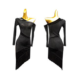 Shimmer and glow in this on-trend Latin dress. This knee-length dress features one shoulder, long sleeve. Made from polyester.