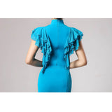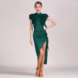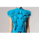 Sparkle and glow in this on-trend Latin dress. This calf-length dress features a round neck, ruffle sleeve. Made from ice silk.