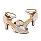 Sparkle and glow in these chic latin shoes. These spool shoes features a open toe cross straps, jewelled pattern. Made from leather/pu.