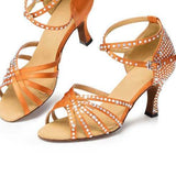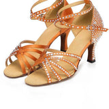 Be an unique beauty in these flattering latin shoes. These  flared shoes features a open toe cross straps, jewelled pattern. Made from satin.