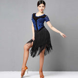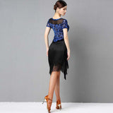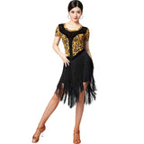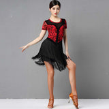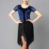 Create an memorable performance look with this chic latin dress. This knee-length dress features a crew neck, short sleeve. Made from milk silk.
