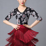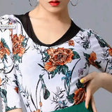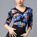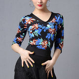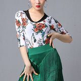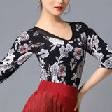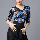 Create a memorable performance look with this chic latin top. This flower print top features a crew neck, 3/4 length sleeve. Made from mesh.