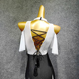 Upgrade your dancing wardrobe season by treating yourself to this feminine ballroom dress. This calf-length dress features a halter neck, half sleeve. Made from polyester.