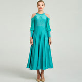 We are huge fans of this sparkly ballroom dress. This long dress features a round neck, 3/4 length sleeve. Made from milk silk.