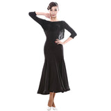 We are huge fans of this elegant ballroom dress. This long dress features a crew neck, 3/4 length sleeve. Made from milk silk.