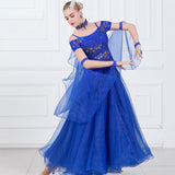 Shine with the glitz and glamour of Broadway in this flattering ballroom dress. This long dress features a off shoulder, short sleeve. Made from spandex.