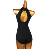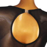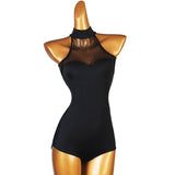 Shimmer and glow in this romantic latin/ballroom leotard. This solid color leotard features a high neck, sleeveless. Made from nylon.