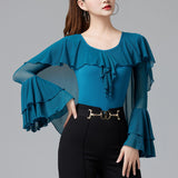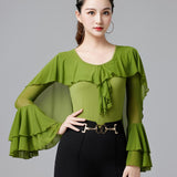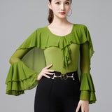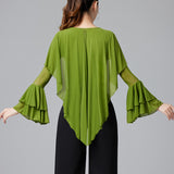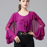 Your dancing closet is just begging to this chic latin/ballroom top. This solid color top features a v neck, short sleeve. Made from polyester.