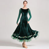 We are huge fans of this pretty ballroom dress. This calf-length dress features a boat neck, extended sleeve. Made from velvet.