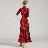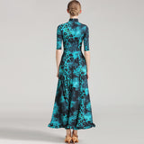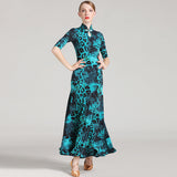 Upgrade your dancing wardrobe season by treating yourself to this striking ballroom dress. This long dress features a mandarin collar, half sleeve. Made from ice silk.