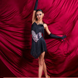 Fire up the stage with this modern latin dress. This knee-length dress features a halter neck, sleeveless. Made from polyester.