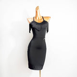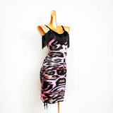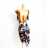 Turn some heads season and notch up some style points in this wild Latin dress. This short dress features a spaghetti strap, sleeveless. Made from milk silk.