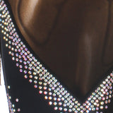Shimmer and glow in this glamorous latin dress. This knee-length dress features a v neck, long sleeve. Made from nylon.