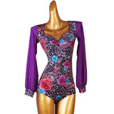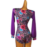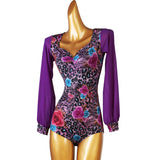 We are huge fans of this flattering latin/ballroom leotard. This leopard print leotard features a v neck, long sleeve. Made from nylon.